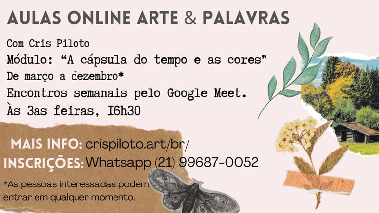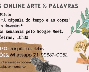 "Arte e Palavras" é uma prática criativa leve e em grupo com encontros online semanais onde ofereço estímulos para criar atividades visuais e de escritas. A cada aula, um estudo teórico e uma proposta de escrita diferente. Não precisa saber desenhar nem escrever poesia! Os únicos pré requisitos são curiosidade e vontade de criar.